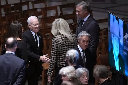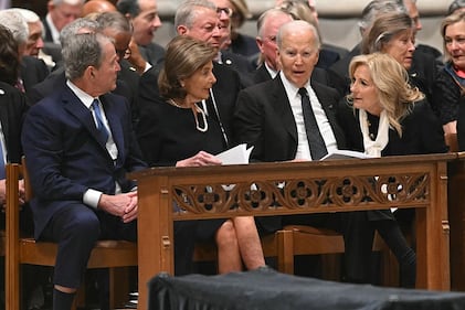 Dick Cheney funeral: Former President George W. Bush and his wife Laura speak with former President Joe Biden and his wife, Jill Biden. (SAUL LOEB/AFP via Getty Images)