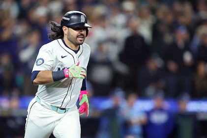 American League Championship Series - Toronto Blue Jay v Seattle Mariners - Game Four SEATTLE, WASHINGTON - OCTOBER 16: Eugenio Suarez #28 of the Seattle Mariners hits an RBI single during the sixth inning against the Toronto Blue Jays in game four of the American League Championship Series at T-Mobile Park on October 16, 2025 in Seattle, Washington. (Photo by Steph Chambers/Getty Images) (Steph Chambers/Getty Images)