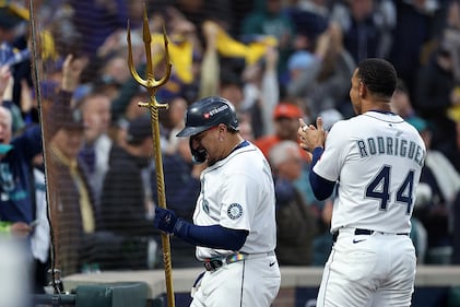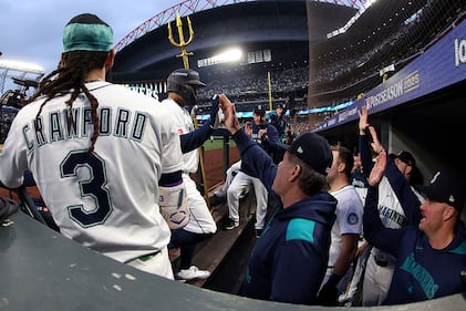 American League Championship Series - Toronto Blue Jay v Seattle Mariners - Game Four SEATTLE, WASHINGTON - OCTOBER 16: Josh Naylor #12 of the Seattle Mariners is congratulated at the dugout after hitting a solo home run against the Toronto Blue Jays during the second inning in game four of the American League Championship Series at T-Mobile Park on October 16, 2025 in Seattle, Washington. (Photo by Steph Chambers/Getty Images) (Steph Chambers/Getty Images)