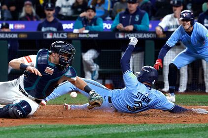 American League Championship Series - Toronto Blue Jay v Seattle Mariners - Game Four SEATTLE, WASHINGTON - OCTOBER 16: Myles Straw #3 of the Toronto Blue Jays scores a run past Cal Raleigh #29 of the Seattle Mariners during the eighth inning in game four of the American League Championship Series at T-Mobile Park on October 16, 2025 in Seattle, Washington. (Photo by Alika Jenner/Getty Images) (Alika Jenner/Getty Images)