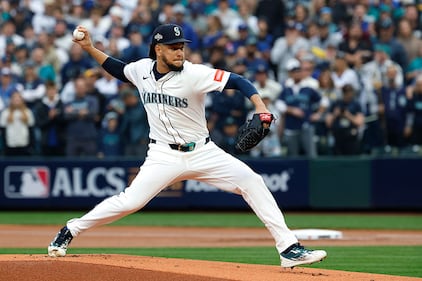 American League Championship Series - Toronto Blue Jay v Seattle Mariners - Game Four SEATTLE, WASHINGTON - OCTOBER 16: Luis Castillo #58 of the Seattle Mariners pitches against the Toronto Blue Jays during the first inning in game four of the American League Championship Series at T-Mobile Park on October 16, 2025 in Seattle, Washington. (Photo by Alika Jenner/Getty Images) (Alika Jenner/Getty Images)