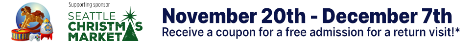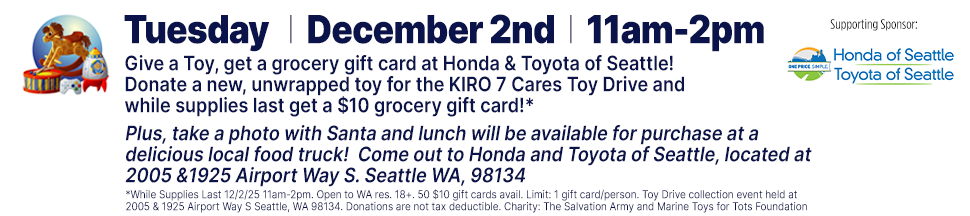 (Participants who donate one (1) new, unwrapped toy at the Seattle Christmas Market in connection with the KIRO 7 Cares Toy Drive, benefitting Toys for Tots and The Salvation Army, will receive one (1) complimentary general admission ticket for a future visit to the 2025 Seattle Christmas Market (Nov 20 - Dec 24, 2025). Limit one (1) toy donation and one (1) complimentary ticket per person. Complimentary tickets are valid for a single entry during the 2025 operating season only, are non-transferable, have no cash value, and will not be replaced, reissued, or refunded if lost, stolen, or unused. Tickets may not be sold or combined with any other offer or promotion. Donations must be received no later than Saturday, December 7, 2025, and this offer is subject to availability while supplies last. All toy donations collected will be distributed to Toys for Tots and The Salvation Army. The Seattle Christmas Market reserves the right to amend, suspend, or terminate this promotion at any time without prior notice.)